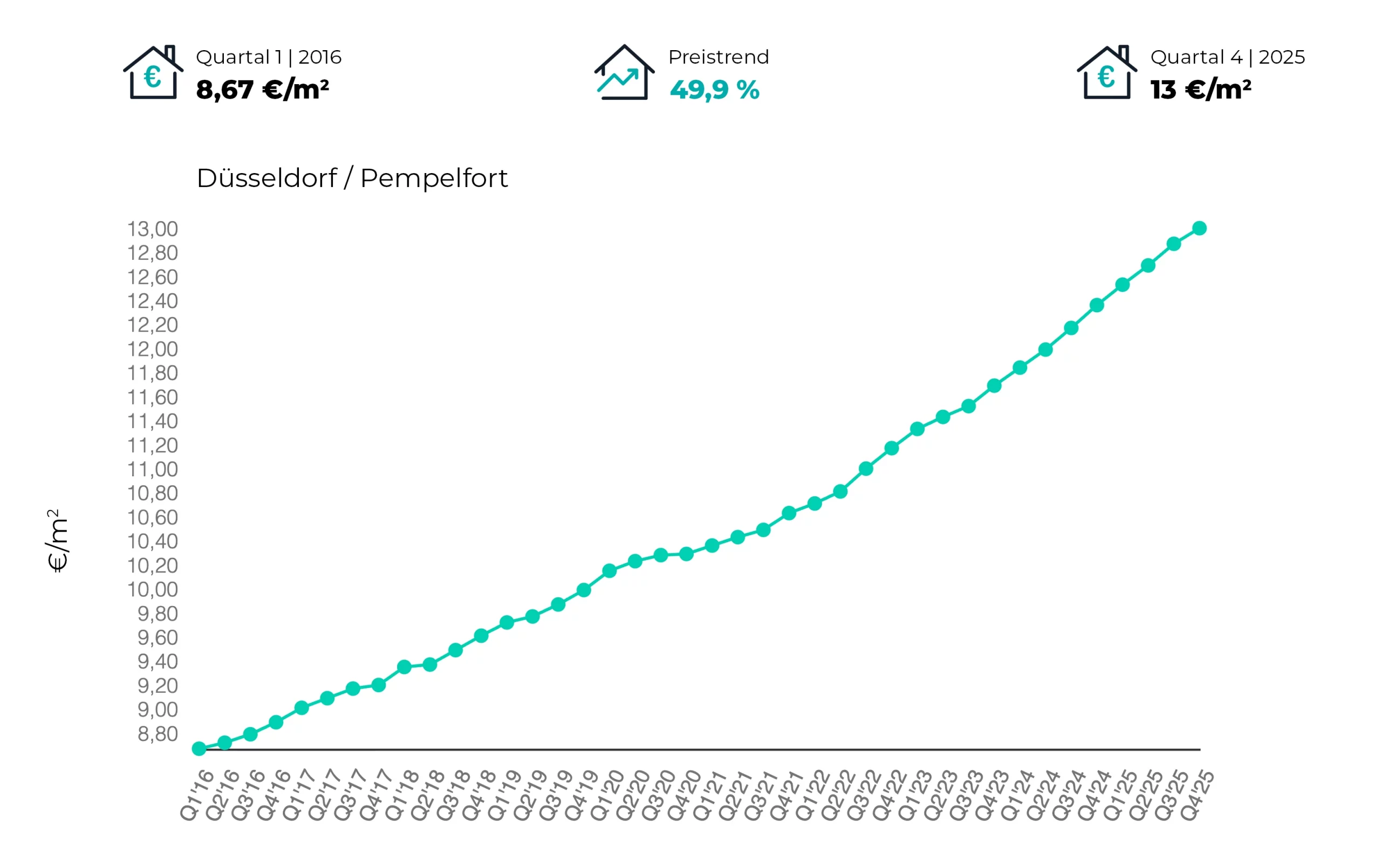 Zum Ende des Jahres 2025 liegt das durchschnittliche Mietniveau in Düsseldorf deutlich über dem Niveau von 2016. Die Angebotsmieten verzeichnen über den gesamten Betrachtungszeitraum hinweg einen stabilen Aufwärtstrend.
