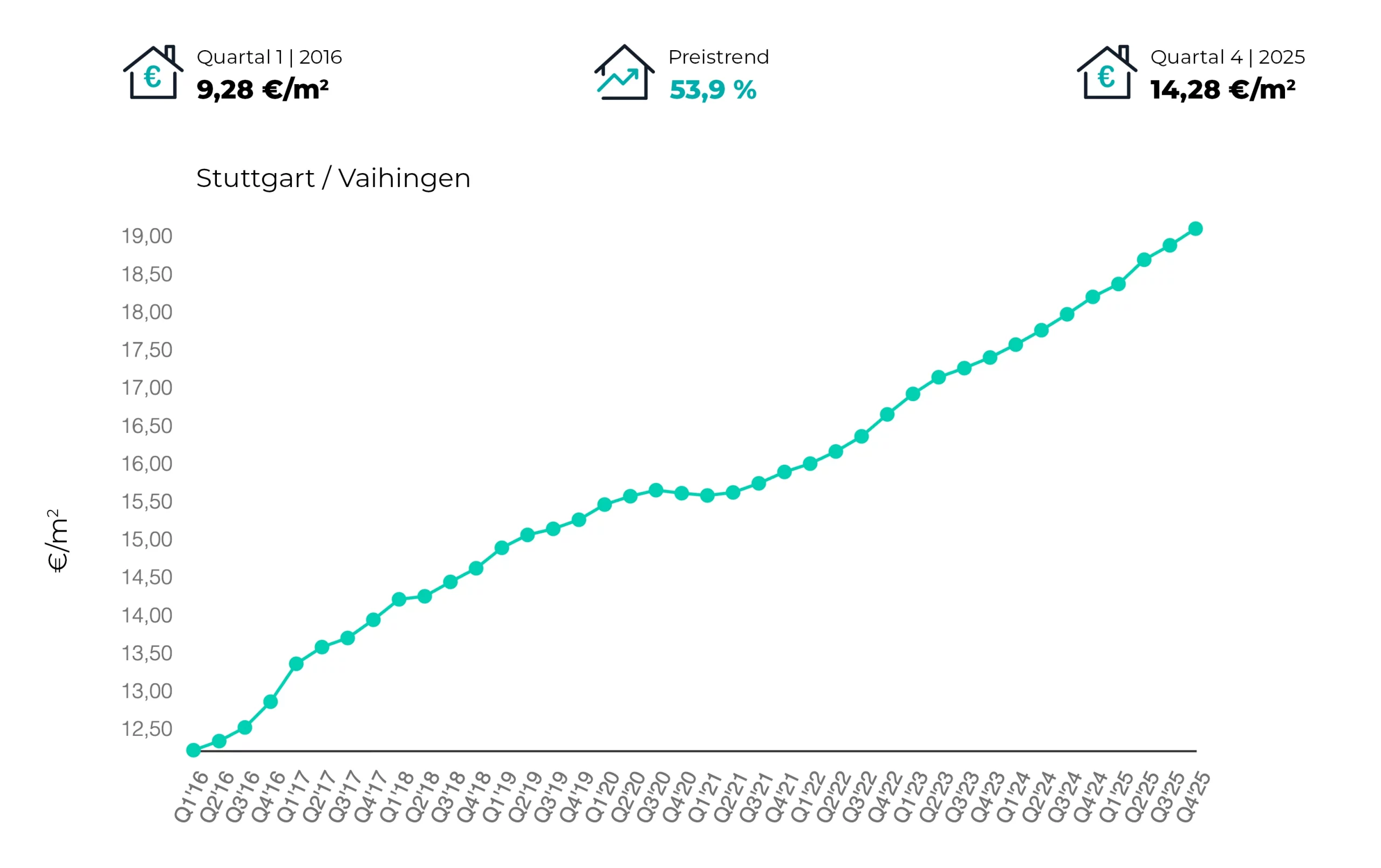 Zum Ende des Jahres 2025 liegt das durchschnittliche Mietniveau in Stuttgart deutlich über dem Niveau von 2016. Die Angebotsmieten verzeichnen über den betrachteten Zeitraum einen stabilen Aufwärtstrend. Nach einer moderateren Phase um 2020 setzte ab 2022 erneut eine beschleunigte Entwicklung ein, die sich bis Ende 2025 fortgesetzt hat.